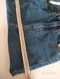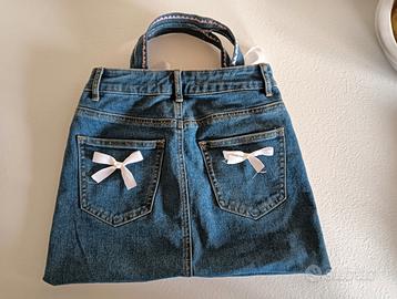 Borsa in jeans fatta a mano. Le tasche sono tutte utilizzabili. Manici per portarla a mano, capiente, morbida e leggera. Volendo, i fiocchetti e le perle si possono facilmente togliere perché sono cuciti a mano.