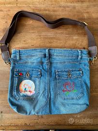 Borsa jeans con disegni dipinti a mano e stampe. Misure: 41x30 Chiusura: cerniera. Prodotto handmade.