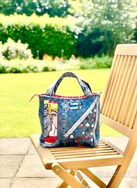 Borsa in tessuto, jeans e riporti in cotone interamente cucita a mano con grande TASCA esterna e ben tre tasche interne di cui una con cerniera, questa borsa è frutto di un lavoro artigianale e di una fantasia creativa
