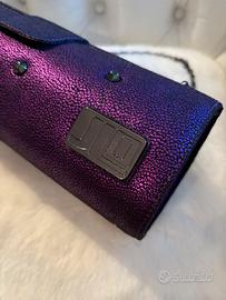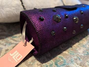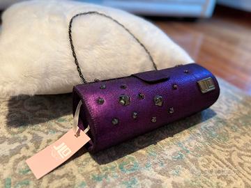 Colore viola metallizzato con borchie decorative, targhetta brand e catenella in metallo color antracite.