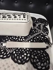 La borsa è in ecopelle con borchie e presenta il logo del brand in metallo sulla parte frontale.È dotata di una tracolla a catena che ne permette la portabilità a spalla o a tracolla.