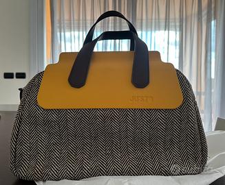 Borsa originale Ju’sto, corpo in tessuto, da portare a mano o a spalla con manici inclusi piu lunghi, sacca inclusa. Dimensioni circa l 42, h 28, p 14. Molto comoda e capiente, usata pochissimo, come nuova.