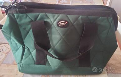 Tessuto ad alta resistenza con motivo trapuntato. Verde scuro e nero. Tracolla amovibile e maniglie per il trasporto. 37 cm. larghezza 31 cm. altezza. È ideale come piccolo borsone per la palestra, per un fine settimana fuori porta o come bagaglio a mano.