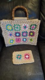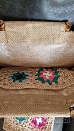 Borsa in juta molto resistente, rivestimento lavorato all’uncinetto Stile Granny NUOVA