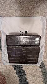 Colore marrone scuro con stampa coccodrillo e finiture color oro. Materiale vegano di alta qualità.