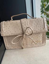 Elegante borsa con texture effetto pelle di struzzo, colore beige chiaro e fiocco decorativo frontale. Dotata di tracolla regolabile e manico corto per doppio utilizzo.