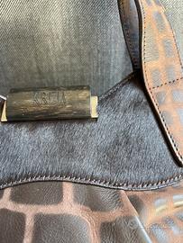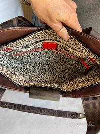 Borsa Krizia in pelle di vitello e cavallino. Può essere indossata a mano grazie ai manici o a tracolla grazie alla catena. La fodera interna e' leopardata con una tasca richiudibile con zip. anche la borsa si chiude con la zip. Utilizzata forse 2 volte, praticamente nuova con sacchetto originale.