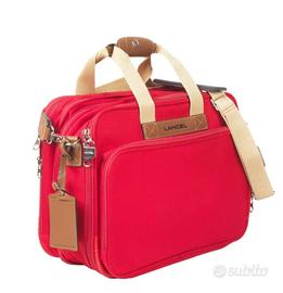 In tela rossa con 4 scomparti di dimensioni diverse tutti chiusi da zip ed organizzati all'interno, perfetta per 48 ore di viaggio di lavoro. Doppio manico e tracolla staccabile in un resistente nastro ecrù con rafforsi i pelle.Dim. cm 40x31x18