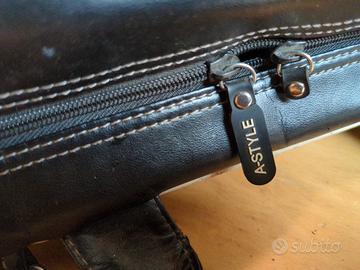 come da titolo, borsa in pelle (suppongo pelle sintetica) con due scompartimenti grandi e una tasca a cerniera all' interno, più una grande tasca a cerniera esterna.
