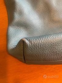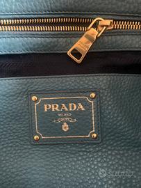 Borsa Prada di un elegante colore blu Marine, con dimensioni di 32 cm di altezza, 46 cm di larghezza e 14 cm di profondità. Ha un aspetto raffinato e presenta piccole usure agli angoli inferiori, facilmente rimediabili con un trattamento specifico. All’interno, la fodera è impreziosita dal logo Prada, con una tasca grande dotata di cerniera e un’altra tasca più piccola anch’essa con il logo. I manici e la tracolla sono arricchiti da dettagli color oro, così come il logo Prada sulla parte esterna, che dona un tocco di lusso e raffinatezza. È una borsa perfetta per chi cerca stile e funzionalità.
