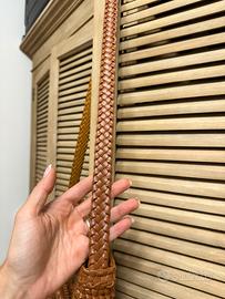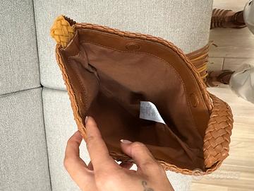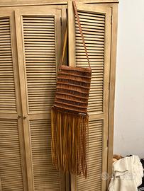 Borsa Liviana Conti, color cuoio con frange, bellissima la lavorazione della borsa e sulla tracolla a treccia con dust e cartellini perfetta per un look boho chic misure 30x35x5