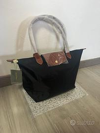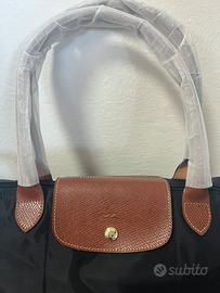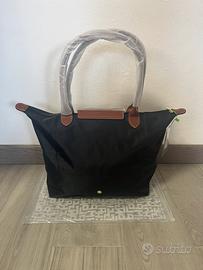Borsa Longchamp Le Pliage, taglia L, colore nero con dettagli in pelle marrone. Molto leggera e capiente, ideale per tutti i giorni, viaggi o lavoro. Può essere piegata facilmente e occupa pochissimo spazio. Spedizione 24/48h. #longchampnera #lepliagelarge #lepliagenoir#longchampl #longchampblackbag #longchampleather
