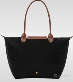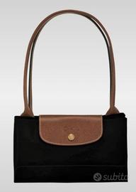 Borsa Longchamp modello Le Pliage, originale, in nylon nero con manici e pattina in pelle marrone. La borsa ha la tipica struttura pieghevole: si richiude su se stessa diventando compatta e facile da riporre o trasportare.
