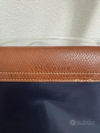 Borsa Longchamp Le Pliage, taglia L, colore blu con dettagli in pelle marrone.