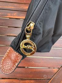 Borsa Longchamp Le Pliage, taglia M, colore nero con dettagli in pelle marrone.