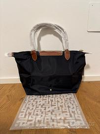 Borsa Longchamp Le Pliage, taglia M, colore nero con dettagli in pelle marrone.