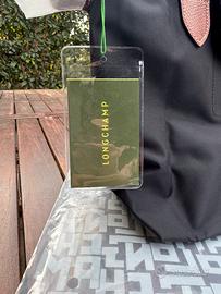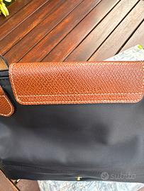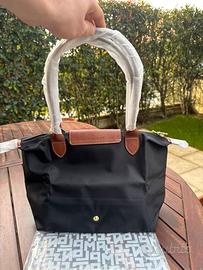 Borsa Longchamp Le Pliage, taglia M, colore nero con dettagli in pelle marrone.