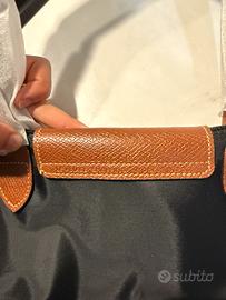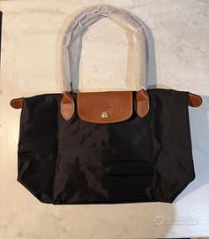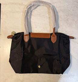 Borsa longchamp nera con dettagli in pelle marroni, taglia M e manico taglia L. Si apre facilmente e diventa spaziosa. Comoda per viaggi e per università. Spedizione in 24h