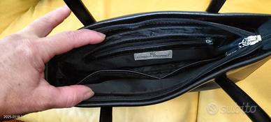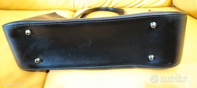 Borsa a mano Lorella Pagano anni '50 in pelle nera, unico vano, all' interno 2 taschini + 1 con cerniera, fondo con tacchetti. altezza totale compreso manico 37.5cm., larghezza base borsa 30cm., larghezza apertura borsa 27cm.