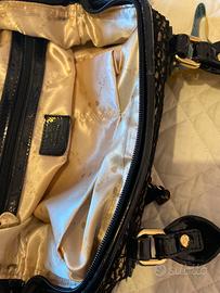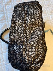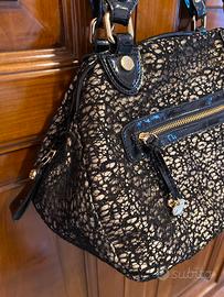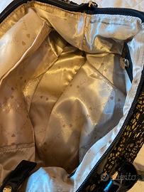 Elegante borsa a mano con dettagli in pelle verniciata e un raffinato pizzo. - Materiale esterno in pizzo. - Dettagli in pelle verniciata lucida. - Manici in pelle verniciata. - Chiusura con zip. - Charm a forma di cuore pendente. misure larg 30 altezza cm 24 prof cm 15 Presenta delle piccole usure marca loristella