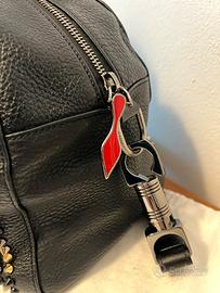 Borsa Christian Louboutin a mano con tracolla modello panettone in pelle di vitello nera con mix di borchie tricolore (argento, oro e nero), interno in tessuto rosso.