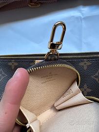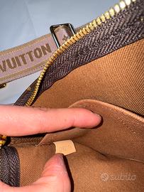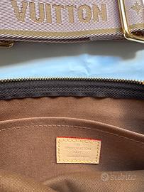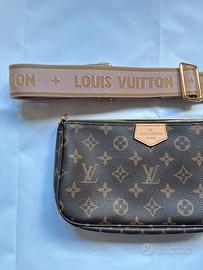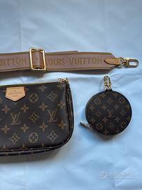 Set elegante firmato Louis Vuitton composto da pochette, tracolla regolabile e mini porta accessori coordinato, caratterizzati dall’iconico motivo Monogram. La pochette è realizzata in tela rivestita con finiture effetto pelle, dotata di chiusura con zip e targhetta frontale con logo. Compatta ma capiente, è perfetta per l’uso quotidiano o per occasioni più eleganti. La tracolla in tessuto, regolabile, presenta la scritta Louis Vuitton ripetuta ed è rifinita con dettagli in metallo dorato e inserti in pelle, ideale per portare la pochette a spalla o crossbody. Completa il set un pratico mini pouch rotondo coordinato, perfetto per monete, chiavi o piccoli oggetti.