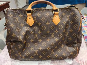 La borsa nell'immagine è unaLouis Vuitton Speedycon la classica tela Monogram marrone. Originariamente lanciata nel 1930 come "Express" e ispirata ai mezzi di trasporto rapidi dell'epoca, è un modello iconico e intramontabile della Maison.
