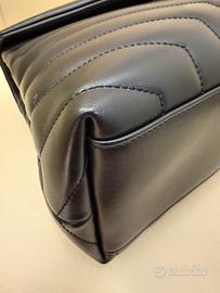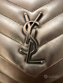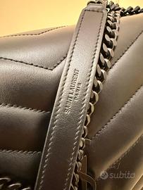 La borsa nell'immagine è la borsa a spalla Loulou di Saint Laurent. Questo modello specifico è in pelle di agnello trapuntata nera con hardware nero opaco (logo YSL e catene).