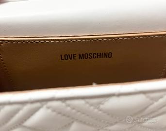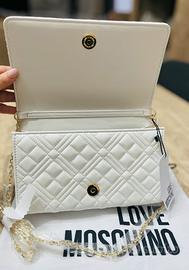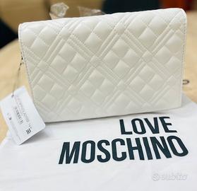 Splendida borsa a tracolla firmata Love Moschino, originale e mai utilizzata. Il colore è bianco perfetto per un outfit sia casual che elegante. Dettagli principali: Modello: Linea "Smart Daily Quilted" con classica lavorazione trapuntata a rombi. Logo: Lettering "LOVE MOSCHINO" in metallo dorato applicato sulla parte frontale. Materiale: Pelle sintetica di alta qualità (ecopelle), molto resistente e morbida al tatto. Chiusura: Pattina con bottone magnetico. Interno: Foderato in tessuto con tasca interna per piccoli oggetti. Tracolla: In metallo dorato e inserto in ecopelle coordinato per il massimo comfort sulla spalla. Condizioni: Come visibile in foto, ha ancora il tag originale attaccato e viene fornita con la sua dust bag (sacca antipolvere) logata Love Moschino. Dimensioni indicative: 22 cm (L) × 14 cm (A) × 6 cm (P) Dettagli tecnici per Categoria: Borse a tracolla Brand: Love Moschino Colore: bianco Materiale: Ecopelle