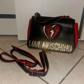 Borsa a tracolla Love Moschino nera e rossa, con scritta dorata e cuore glitterato sul davanti. Dotata di tracolla regolabile e removibile. Capiente e perfetta sia per il giorno che per la sera. Buone condizioni qualche segno di usura nella pelle sotto la borsa dove appoggia