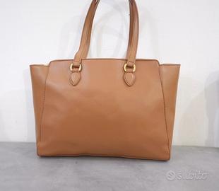 Borsa a spalla firmata Moschino Love, marrone chiaro con doppio manico, ha dettagli dorati ed è piu che in ottime condizioni, usata a malapena come si evince dalla pellicola protettiva ancora sulla cerniera, ma stando con altre borse si sono formati i piccoli segni visibili dalle immagini, è grande e capiente, misura in altezza 25 cm, in larghezza 35 cm e in profondità 9 cm
