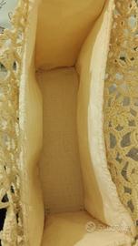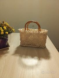 Titolo: Borsa Gioiello Artigianale – Pizzo d’Irlanda, Bambù e Lino 100% Testo dell'annuncio: Vendo borsa esclusiva realizzata interamente a mano, un vero pezzo unico di alto artigianato che unisce l'eleganza senza tempo del pizzo d’Irlanda a materiali naturali di pregio. Esterno: Raffinato ricamo a uncinetto con motivi floreali a rilievo color panna e base in lurex bronzo. Interno: Foderata internamente in puro lino 100%, una scelta di pregio che garantisce resistenza, freschezza e una rifinitura impeccabile. Dettagli: Manici originali in vero bambù, per un tocco naturale e sofisticato. Personalizzazione: Questo modello può essere realizzato su richiesta in diverse misure, per adattarsi perfettamente alle vostre necessità. Un accessorio unico, nato dalla cura estrema per ogni singolo punto e dalla scelta di materiali nobili. Perfetto per cerimonie, eventi o per chi vuole indossare un'opera d'arte artigianale. Disponibile per spedizione o ritiro a mano. Contattatemi per informazioni o per richiedere la vostra versione personalizzata!
