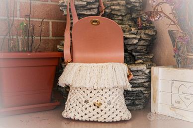 Borsetta originale realizzata interamente a mano con filo di cotone 100% usando la tecnica del macramè, Ha delle frange interne aperte ed è arricchita da inserti in cuoio rosa che valorizzano il design: base, parte superiore frontale e tracolla.