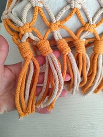 Bellissima borsa realizzata con la tecnica del macramè. Ho realizzato tutto con corda di cotone 100% da 5 mm certificato Oeko Tex (certifica che non ci sono sostanze nocive per l' uomo e l' ambiente). Borsa/sacca interna rimovibile, sempre tessuto di cotone realizzata con la macchina da cucire. Maniglie in legno.