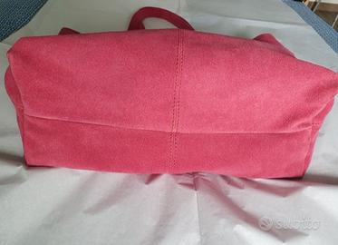 Mai adoperata, borsa Mango, in vera pelle, scamosciata, colore viola fuxia, morbidissima, molto spaziosa, leggera, con grande tasca interna in cotone, con cerniera, bottone a pressione.