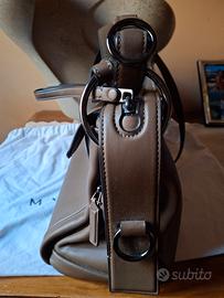 elegante borsa color kaki, NUOVA, in pelle liscia con sacca antipolvere, logo metallico su lato esterno e interno, capiente tasca interna + una con zip, tasca esterna con patta, tracolla a spalla o a mano e altra tracolla regolabile, ottima anche per uso professionale, cm 33 x 23 x 15