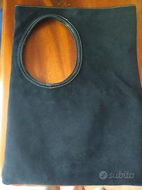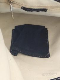 in pelle di camoscio blu foderata con tela bianca con tasca interna da usare a tracolla e piegabile come pochette dimensioni cm 44 e 32 larghezza con custodia originale