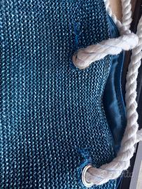 Borsa mare tipo raffia blu' manici corda usata ma puo' ancora essere utile ..vendo x fare spazio...ci sono ciabattine da abbinare cammomilla il set . Vedere ultima foto riprese della raffia dovute alla conservazione