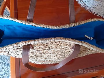borsa mare di paglia foderata con stoffa azzurra con cerniera e tasca interna con lacci in cuoio. altezza cm 30, larghezza cm 57