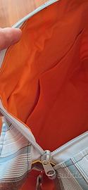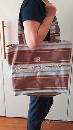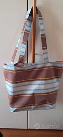Bella e capiente borsa mare, realizzata in tela di cotone, unica nel suo genere, dotata di cerniera , due tasche frontali più due interne, all'interno anche gancetto porta trousse. Realizzata e cucita a macchina, molto apprezzata anche come regalo Dimensioni circa 55x35x18 cm
