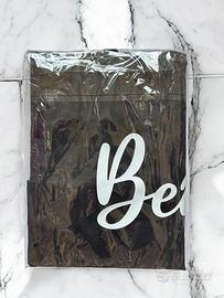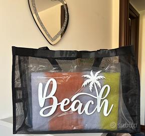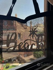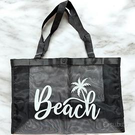 Grande borsa mare a spalla, in mesh nero traspirante con scritta "Beach" e palma a contrasto in bianco. Capiente e ben fatta, chiusura con bottone automatico.