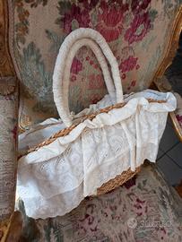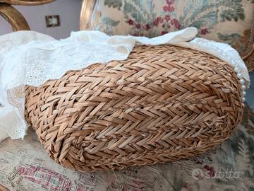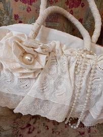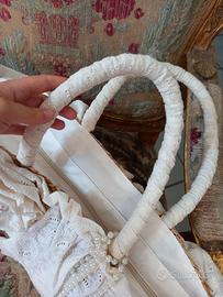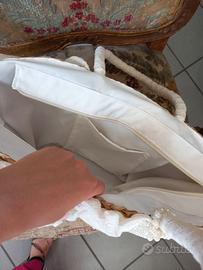 Borsa mare in vimini, stile positano, con rivestimento in pizzo sangallo. Decorata con coccarda e collana di perline. Chiusura con zip e tasca interna portaoggetti.