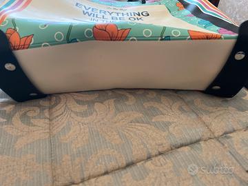 Borsa da mare impermeabile e rigida con base rigida che misura cm 12x38 molto capiente e comoda da poggiare anche sulla sabbia in quanto resistente; bella fantasia tipica del marchio suo e chiusura con due laccetti e manici attorcigliati tipo trecce. All’interno unica tasca chiudibile con zip portaoggetti piccoli.