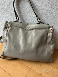 Borsa Marks & Angels by Alessia Marcuzzi in pelle grigia, manico superiore con tracolla staccabile e regolabile, indossabile cross-body. Dimensioni ca. 33x22 cm, profondità 7. Buone condizioni generali, angoli, sotto e interno ok, solo un po’ di usura lato corpo e un piccolo segno sotto la chiusura della fibbia come si vede nelle ultime 2 foto