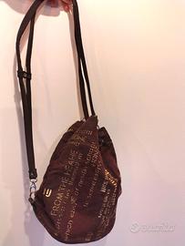 Comoda e capiente borsa in stoffa morbida color marrone con scritte in oro luccicanti.