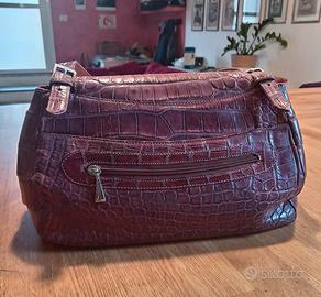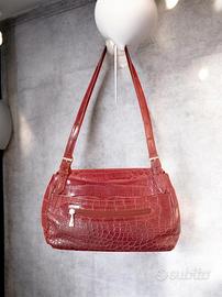 Borsa vintage in pelle con stampa coccodrillo(o rilievo coccodrillo), colore marrone rossastro, con una patta frontale coordinata che chiude lo scomparto principale.