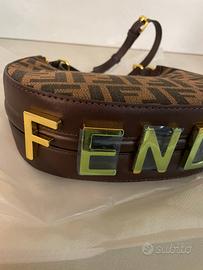 La borsa presenta l'inconfondibile motivo FF jacquard nei toni del marrone e del tabacco, rifinita con dettagli in morbida pelle marrone. Il vero tocco di classe è la maxi scritta in metallo color oro sulla base, che diventa visibile quando la borsa viene portata a spalla.