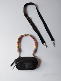 Borsa in nylon convertibile, infatti ha due manici, uno in corda stile trekking, e una tracolla regolabile, entrambi rimovibili, che permettono di utilizzarla come borsetta o come marsupio. Inoltre ha anche una maniglia fissa sul retro per usarla come pochette.