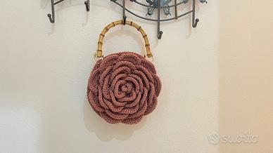 Borsa realizzata interamente a mano ad uncinetto Fatta a rosa davanti/dietro Colore rosa antico 2 Manici in bambu Ottima per eventi