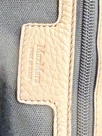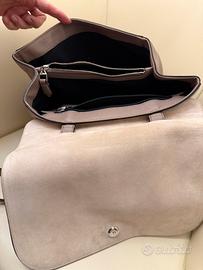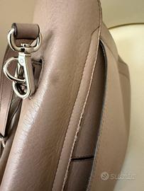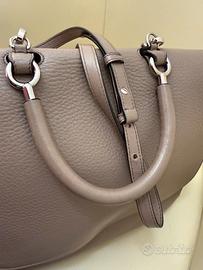 Borsa in pelle di colore beige/tortora con tracolla amovibile, completa di sacchetto.